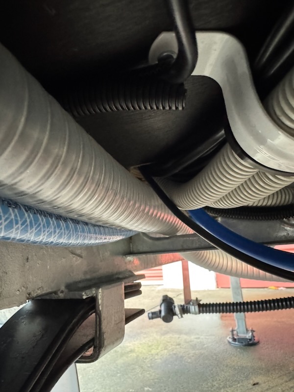 I woke early this morning due to having a window just above our heads at my parents place, which meant it was bright at about 5am. Since it wasn't raining, I wandered outside to see if I could work out what this cable/hose that was dangling under the caravan was. It quickly became apparent that I'd need to get under the van for a closer look, so it was back inside to get dressed in work clothes. I crawled under the van and traced the cable to a hole in the floor under the water pump.