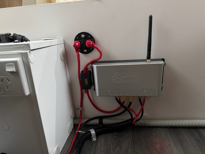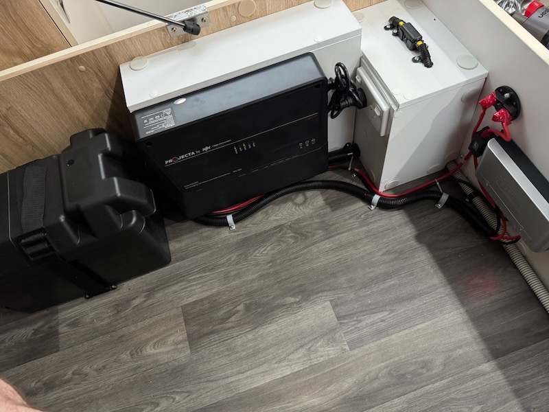 That was pretty much it for under the van, so inside we went. Lots of discussion around exact placement of components, and then a lot of cable cutting and terminating with various size ring ends for the various terminal sizes. Around 5:30pm or so, we had everything wired up and neat.