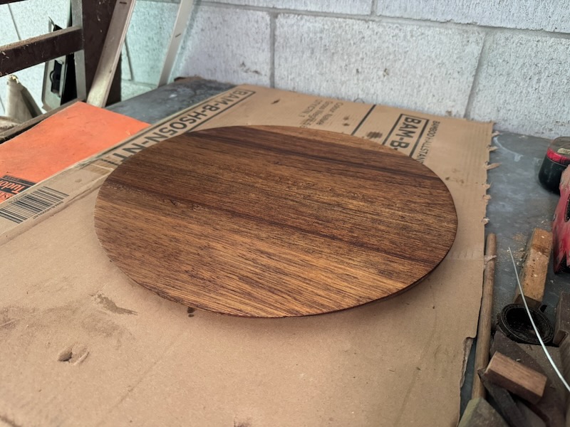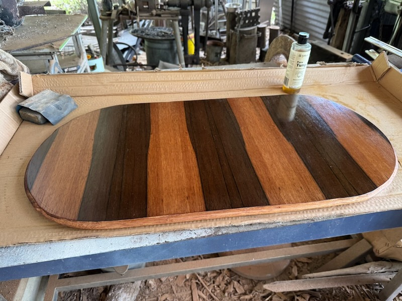 The other news is that I've spent the weekend making chopping boards. Initially a round board to fit in the sink of the caravan, thereby giving me a bit more bench space when the sink isn't in use, and a large oval one that covers the sink and strainer area. That second one may end up being too much of a faff to pack, but we'll try it out on one of our short trips to see if it is worth it. The idea is that it's a larger surface all at the same level, so useful for rolling out dough and the like.